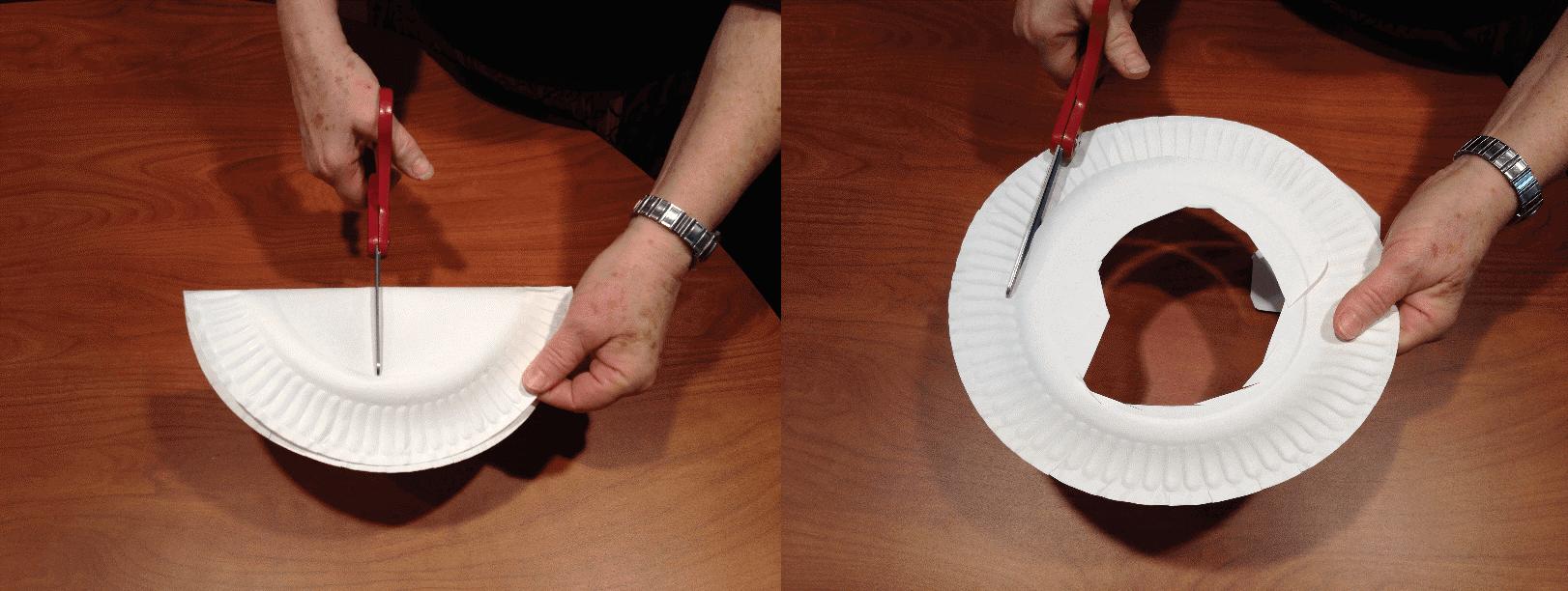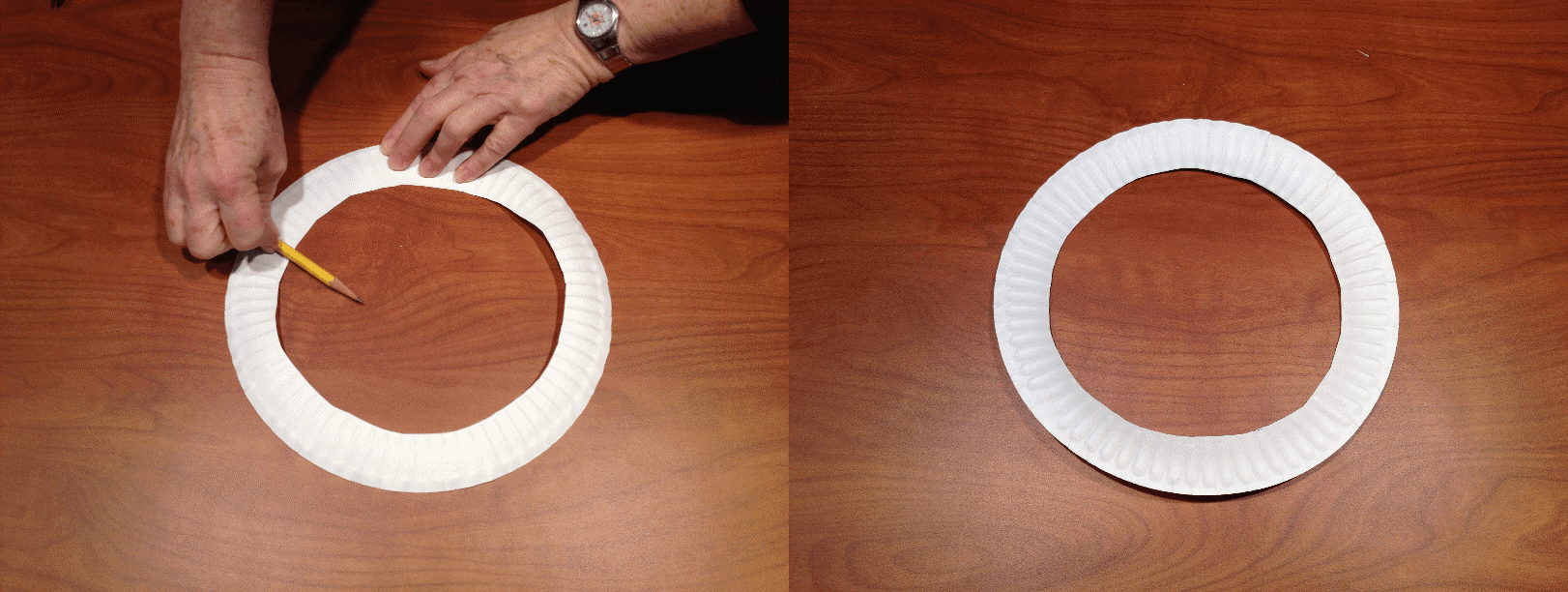 Dobla el papel por la mitad. Corta un agujero en el centro. Corta un agujero más grande dejando un borde de 1 pulgada o 1,5 pulgadas alrededor del exterior del plato. Aplana los extremos del plato con un lápiz.