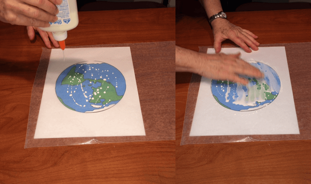 5. Coloca la mitad del papel de horno sobre la plantilla y pon pegamento sobre el papel, tal como se ve en la imagen.