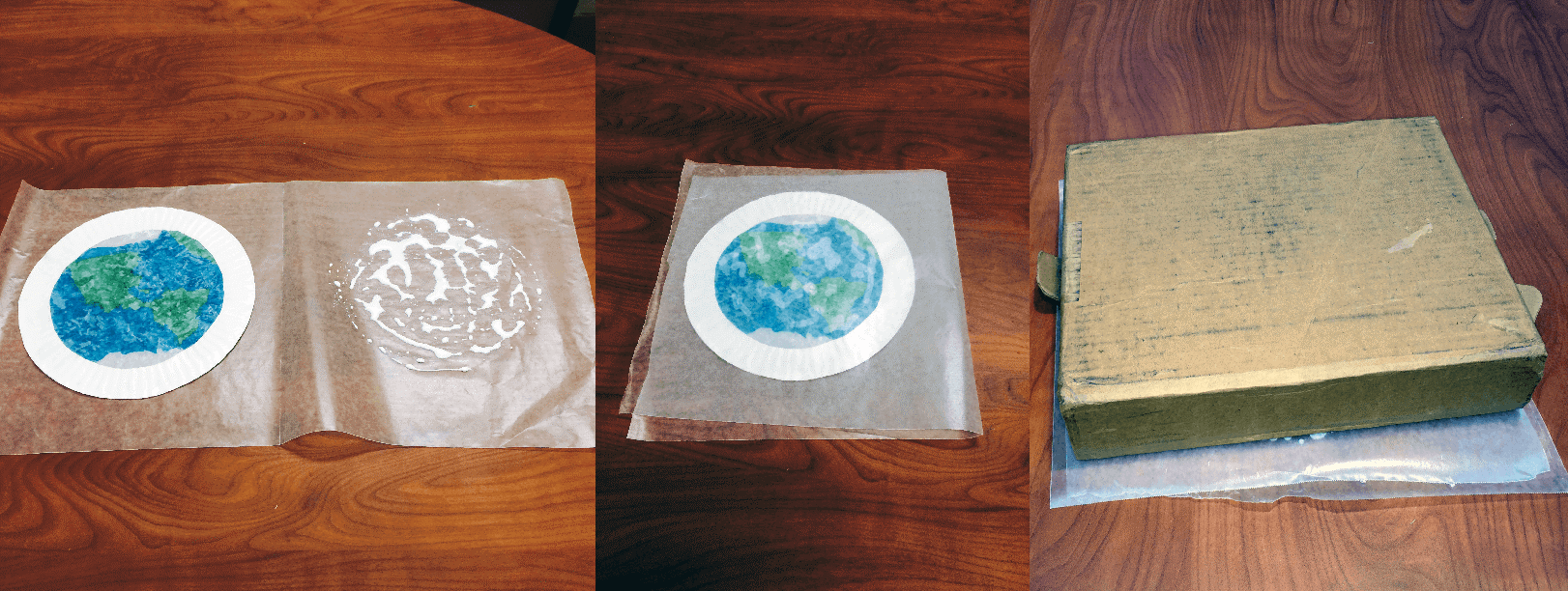 9. Dale la vuelta de nuevo y pon pegamento en la otra mitad del papel de horno. Coloca el papel de horno sobre los pedazos de papel de seda. Pon un libro o una caja pesados durante 15 o 20 minutos.